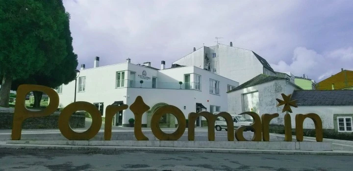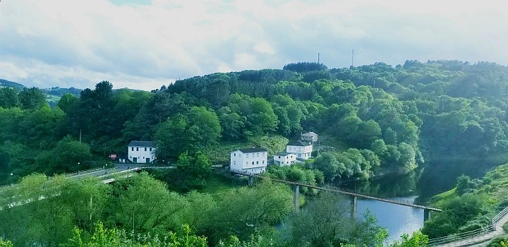 긴 다리 가로놓인 너른 미뇨(Mino) 강 맞은편으로 하얀 건물이 옹기종기 모인 현대 도시가 드러난다.