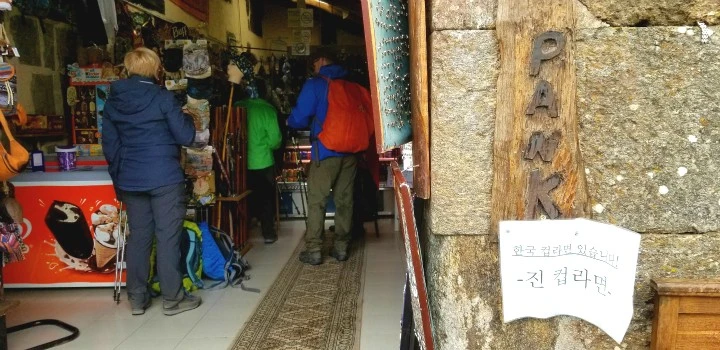 사리아에서 산을 넘어 첫 동네로 들어서자 작은 가게가 나왔는데 한글로 쓴 '진 컵라면'도 있었다.