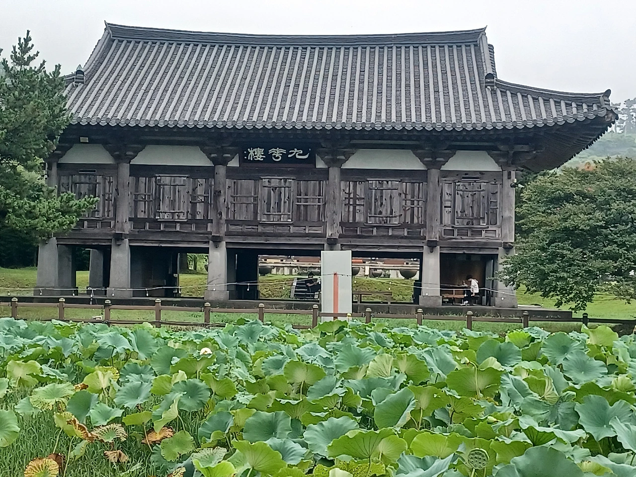 구품연지 마주 지켜보며 외외하게 서있는 이층 누각 구화루(九華樓).