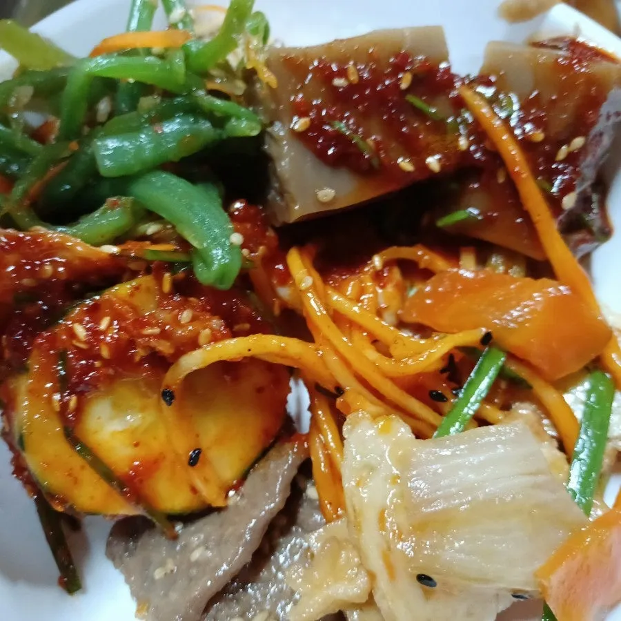 매콤한 부추무침 오이무침 콩나물무침, 좋아하는 고구마줄기 볶음과 꽈리고추 볶음에 멸치볶음, 계란부침이며 콩고기 묵무침 등이 담겨있다.