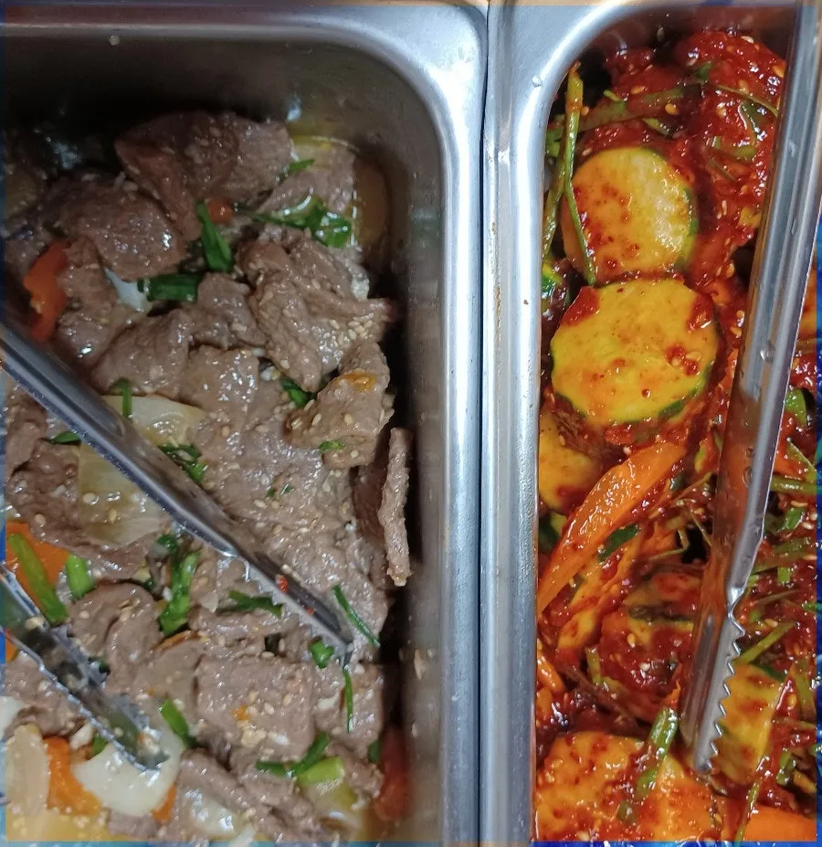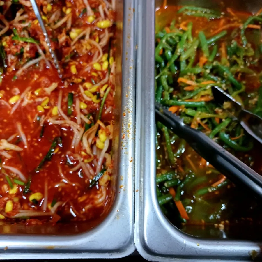 ㄱ자 형으로 좁다랗게 난 테이블 중앙에 뷔페식으로 반찬통이 여남은 개 바투게 놓여있었다.