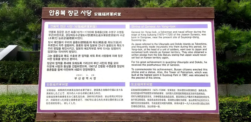 안용복(安龍福), 그는 조선시대 수군으로 사적의 갈피에 파묻혀 거의 알려지지 않은 인물이다. 갑남을녀의 한 사람인 평범한 백성이었으나 진작에 변경(邊境)의 중요성을 인식한 선각자적 혜안이 돋보이는 그. 역사에 뚜렷한 기록으로 남겨진 이름은 아니지만 이처럼 의식 있고 슬기로운 민중들로 해서 국경선이 지켜져 왔으니. ‘동해 밖에 한 조각 외로운 섬, 아무도 내 땅이라고 돌아보지 않을 적에…’ 안용복의 충렬을 기리는 이은상의 헌시가 새겨진 충혼비가 부산 수영공원에 있다. 그는 동래 땅 남촌, 지금의 수영 출신으로 숙종 19년 봄, 어민들과 어울려 울릉도 부근으로 고기잡이 나갔다가 일본에 잡혀간다. 몇 해를 억류된 채 지내온 그는 어학에 능한 자질인지 곧 일본어를 익혔다. 일신 보존조차 어려운 입장임에도 그는 막부에 나가 울릉도는 우리 땅임을 당당히 주장, 마침내 그들을 설득시켜 도쿠가와막부가 승인하는 서계(書契)를 받아 낸다.