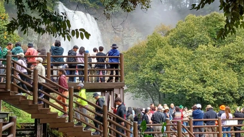 폭포로 올라가는 인파와 내려오는 사람들로 북새통인 도로.
