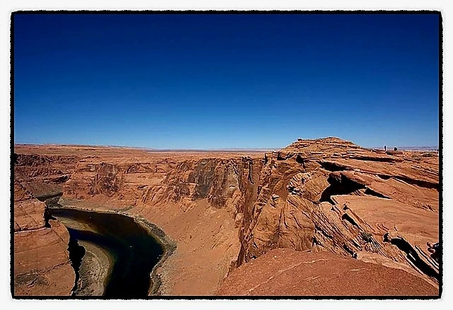 말발굽 모형의 거대한 붉은 바위를 휘어 돌며 장관을 이룬 콜로라도강이 저 아래,