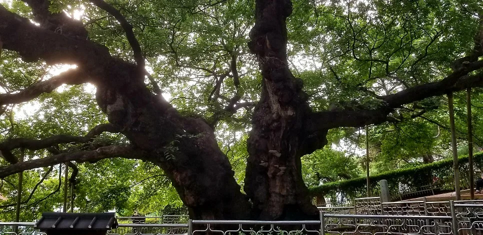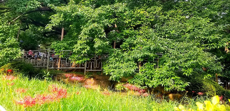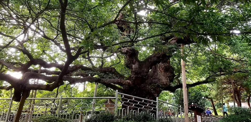 수영공원 동쪽 비탈에는 우람한 수세로 그늘 넓게 드리운 푸조나무가 서있다. 위엄 어린 풍모의 푸조나무는 두 그루가 한자리에서 자라 북쪽은 할아버지 나무, 남쪽은 할머니 나무로 불리는 노거수다. 하도 거대해서 전체를 한꺼번에 사진 찍기 어려워 문득 유럽 대성당의 위용을 떠올리게 했다. 대체로 옆으로 기울어져 자라는데 줄기 여기저기 상처진 자취가 있고 혹도 생겼으며 심지어 왕버섯도 돋아있다. 수령 500년이 넘는 천연기념물 제311호다.