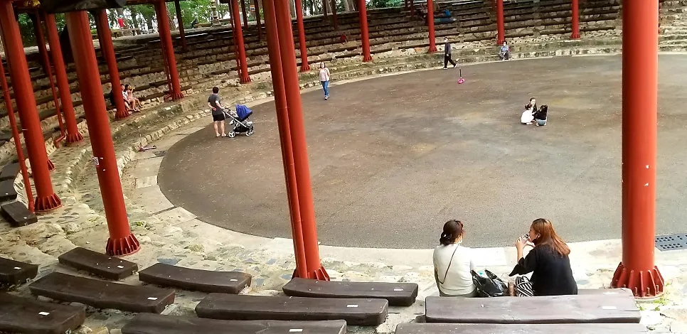 중요무형문화재 제43호인 수영야류, 수영 들놀이를 공연하는 놀이마당이 공원 북쪽 기슭에 자리해 있다. 전에는 탁 트인 공간이었는데 이번에 와보니 층계 자리에 지붕 덮개까지 말쑥해져 마당놀이 기분은 떨어졌다. 정월 대보름날 산신제(山神祭)와 함께 수영야류가 질탕하게 행해지곤 했는데 야류는 수영고적민속보존회가 주관했다. 직접 구경한 적이 있는 탈놀이는 수양반과 말뚝이의 능란한 재담이 박장대소하게 만들어 스트레스를 날려줬다. 하인 말뚝이가 독설과 신랄한 풍자로써 음흉한 양반의 이면상을 폭로하며 양반계급의 무능과 허세를 조롱하는 재담에 손바닥에서 불이 나게 손뼉을 쳤던 기억이 떠올랐다.