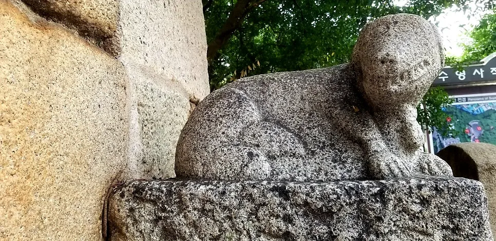 남문에는 성벽 일부와 홍예석, 우주석, 하마비 등이 남아 있다. 입구 아치식 석문인 남문에는 사각형의 우주석 위에 화강암 박견(狛犬) 한 쌍이 양쪽에서 마주 보고 있다. 일반적으로 입구에 세우는 해태나 범이 아니라 독특하게도 석물로 새긴 개다. 이 박견은 조선시대부터 원래 문 앞에서 집을 지키는 용맹스러운 동물이었다고. 그처럼 나라의 관문인 좌수영 성곽 앞머리에서 두 마리 개가 두 눈 부릅 뜨고 이빨 드러낸 채 버티고 앉아 지키는 문. 옛 수영 사람들 항전의 혼이 담겨 있는 역사의 터는 지금 인근 주민들의 운동장이자 휴식공간이 되었다.