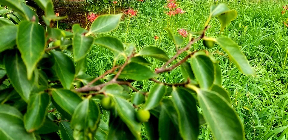 콩알 크기인 푸조나무 열매와 두터운 이파리, 그 아래 풀숲에 피어난 꽃무릇