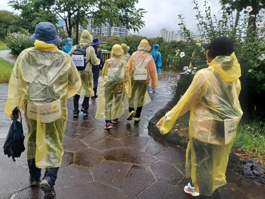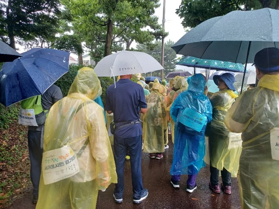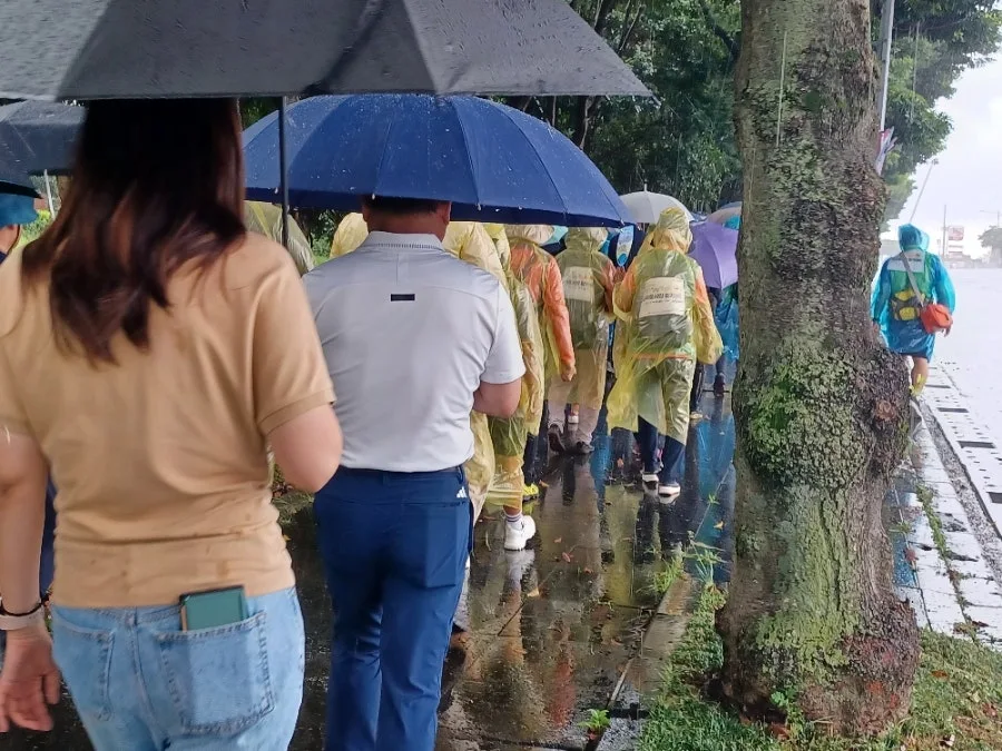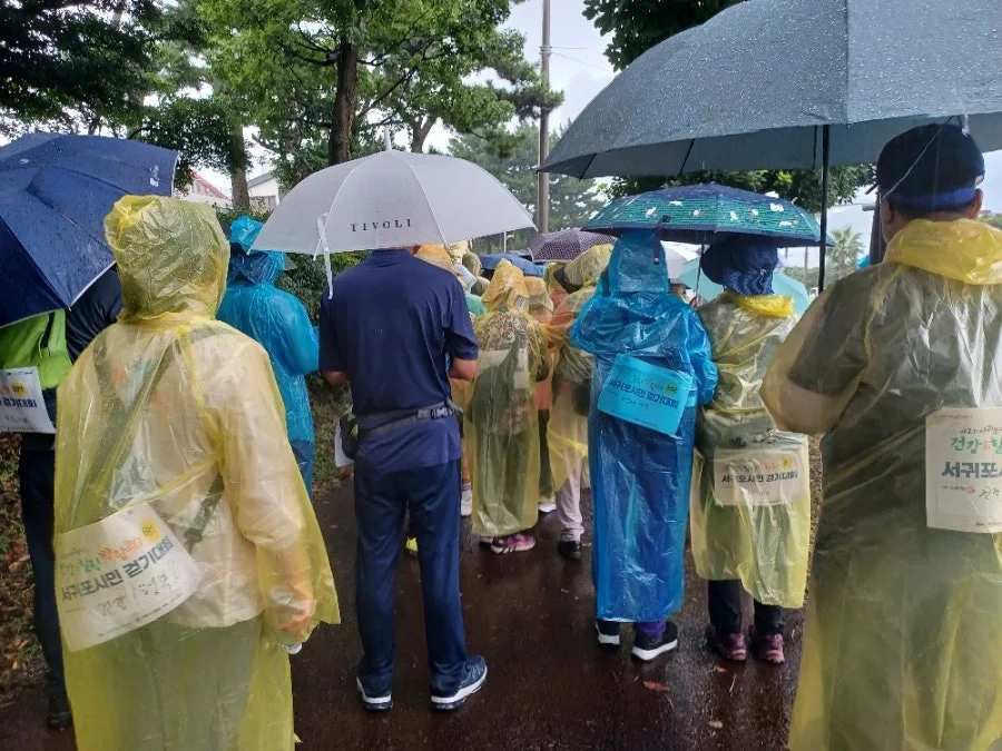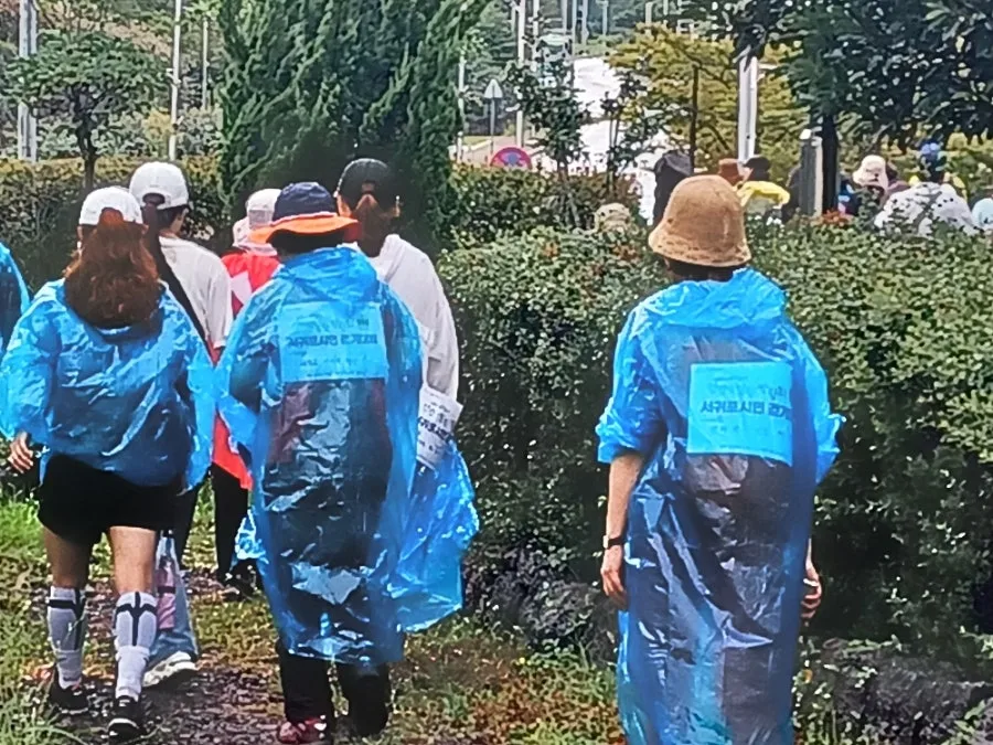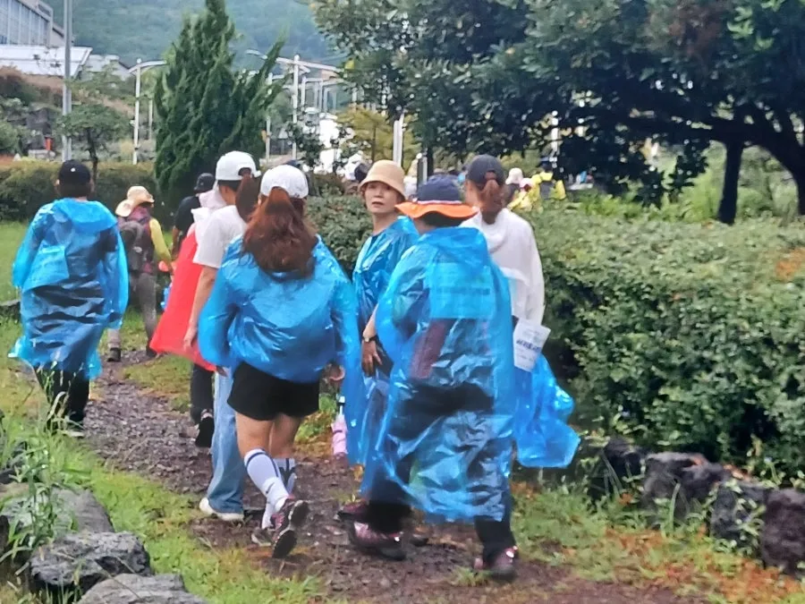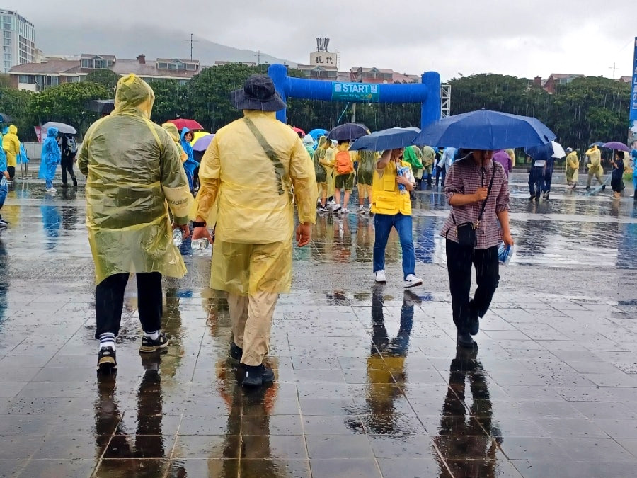 마침 주최 측에서 배낭과 우비를 제공하여 비옷을 입거나 우산을 쓰고 걷기 시작했다.