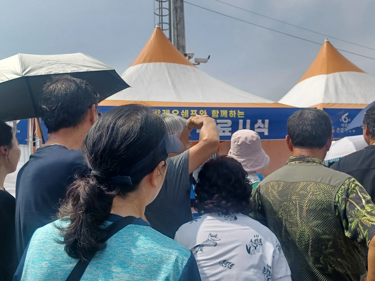 예년의 붐비던 인파와는 달리 무대 앞 객석 허술한 편인데 갈치튀김과 갈치회 시식코너 줄만은 길게 이어져 있었다.
