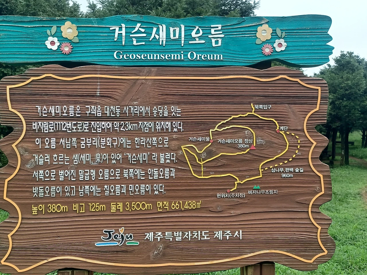 오름 안내 지도를 읽고는, 어차피 조망권이 트이지 않는 우중이라 정상 제치고 둘레길을 따라 걷기로 했다.