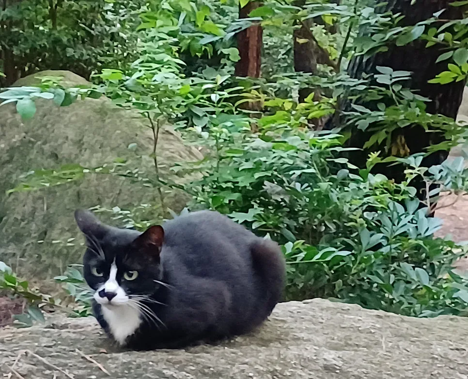 송림에도, 바위 위에도, 숲 그늘에도, 팔각정에도, 소림사 돌담에도 길냥이가 옹송거리고 앉아 마주 본다.