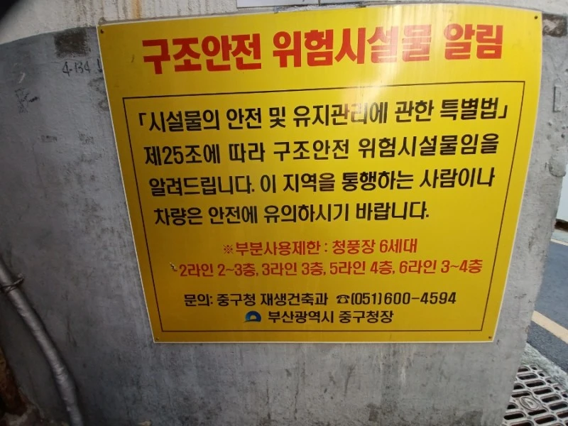 재난위험 시설로 지정됐으니 통행과 주차에 주의하라는 알림판이다.
