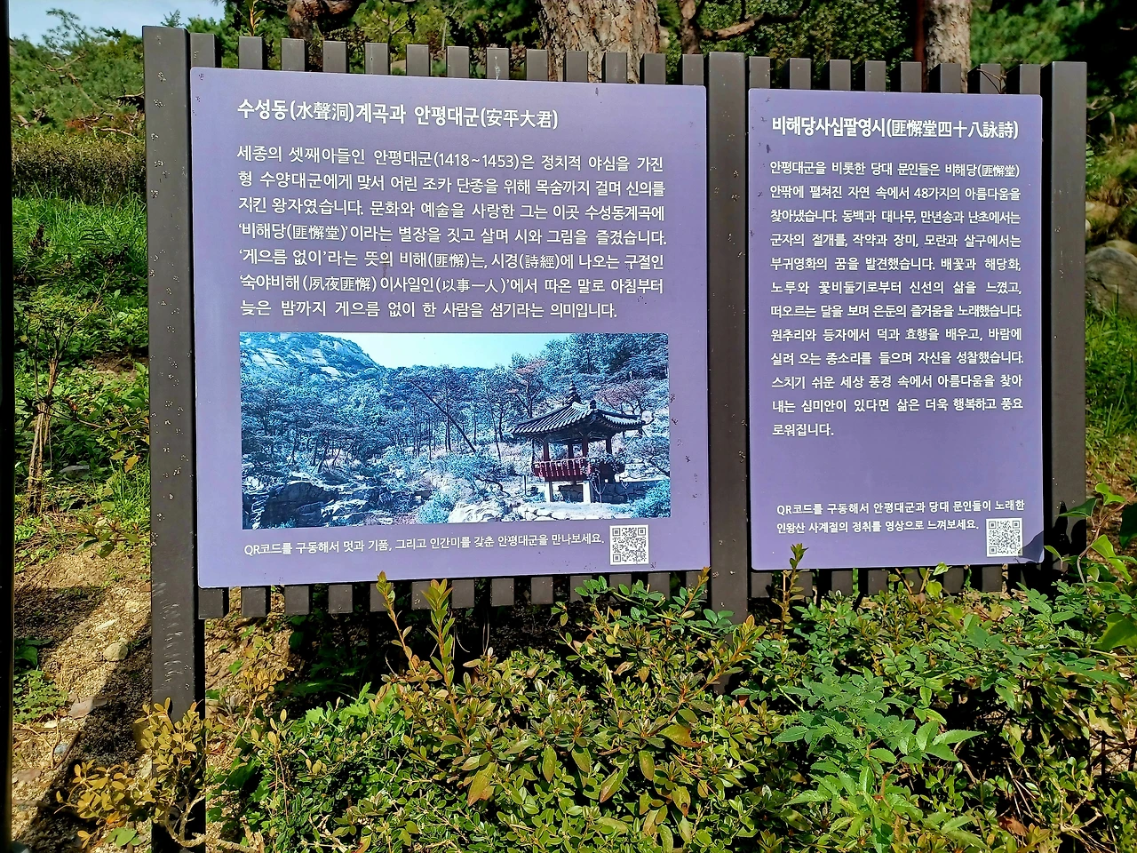 “수성동은 인왕산 기슭에 있으니 골짜기가 그윽하고 깊숙하여 시내와 암석의 빼어남이 있어 여름에 놀며 감상하기에 마땅하다. 혹은 이르기를 이곳이 비해당 터(안평대군 이용의 옛 집터)라 한다. 다리가 있는데 기린교(麒麟橋)라 한다.” 는 옛 기록대로 골짜기는 깊고 암석마다 빼어난 자태다.