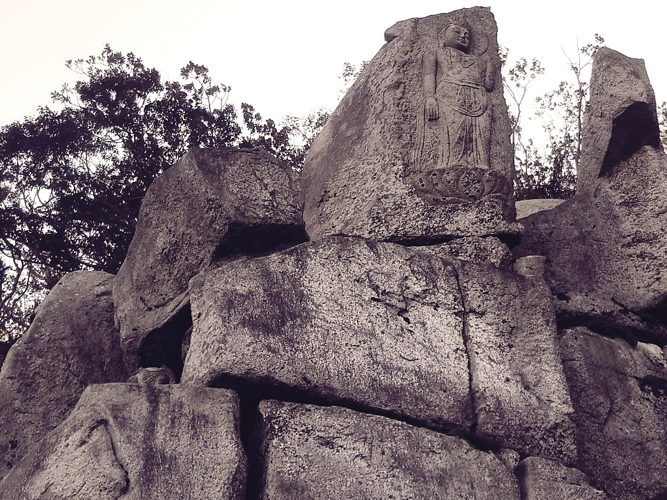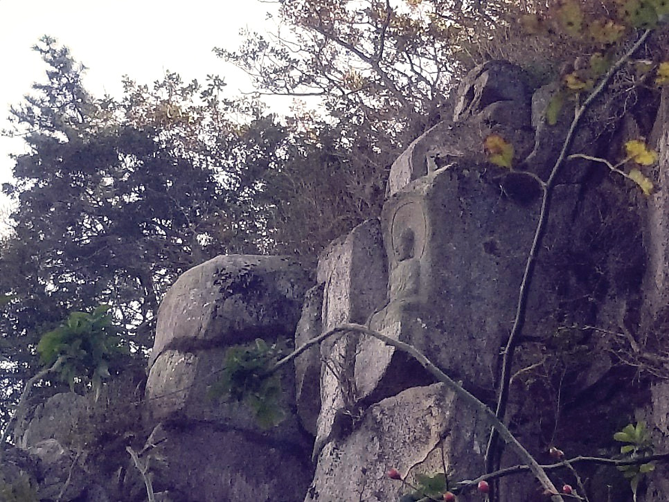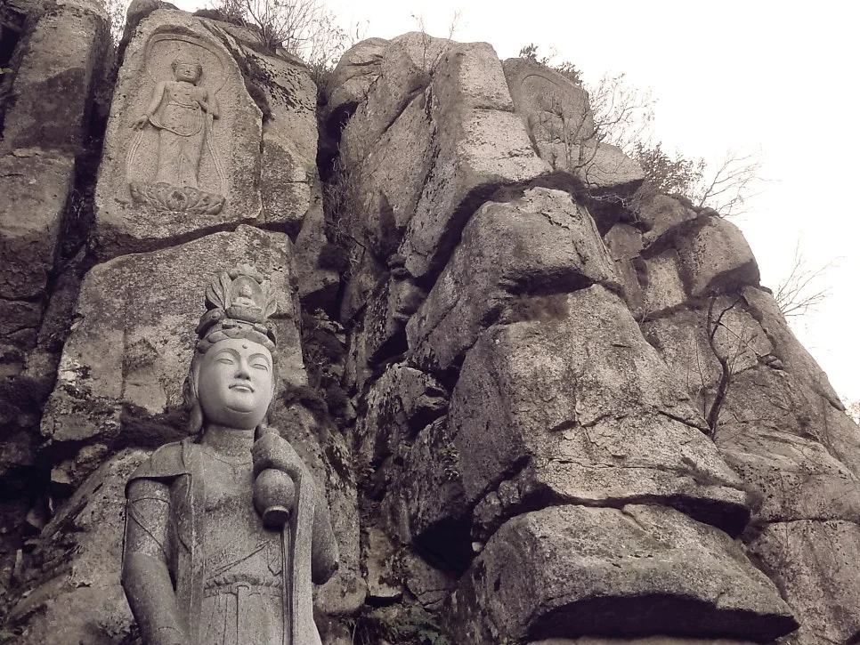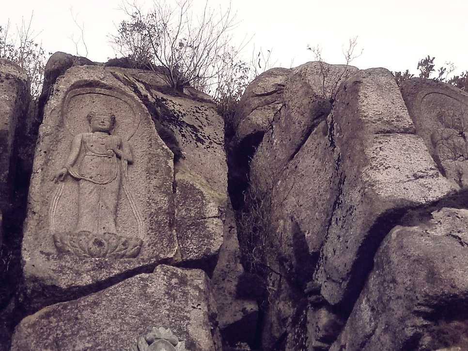 락 클라이밍 연습하기 적당할 것 같은 암벽이네, 싶었는데 높다란 바위 꼭대기에는 삼존불이 조각돼 있었다.
