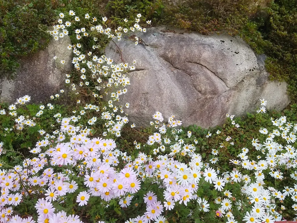 길가 바위 곁에 연보라꽃 하얀 꽃 자잘한 들국화 한창 흐드러져 있었다.