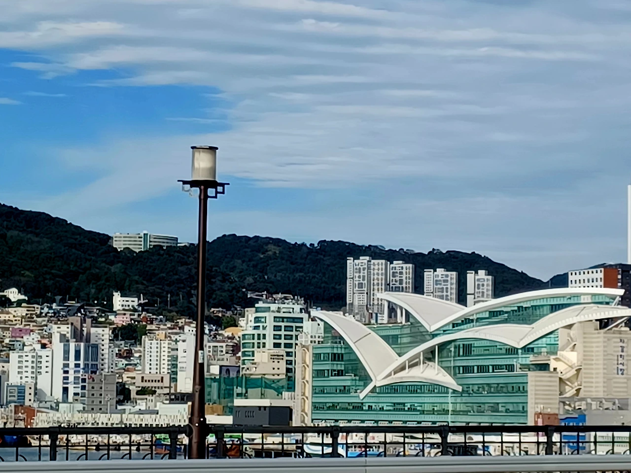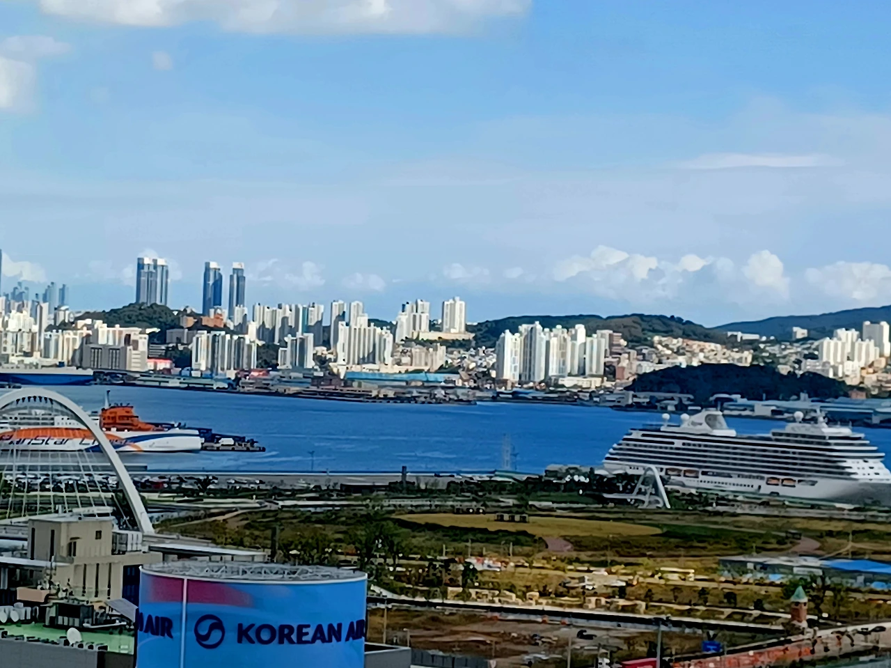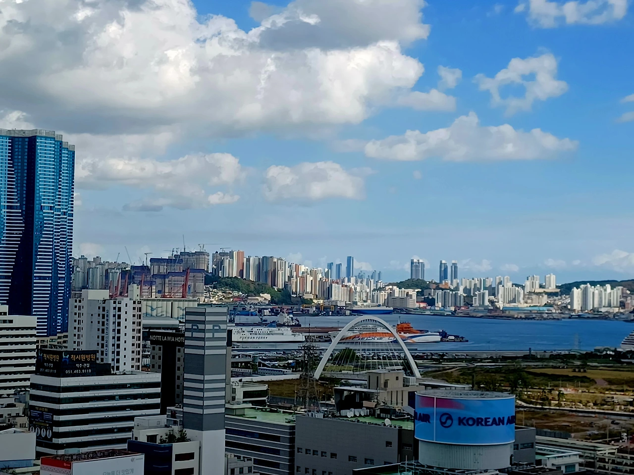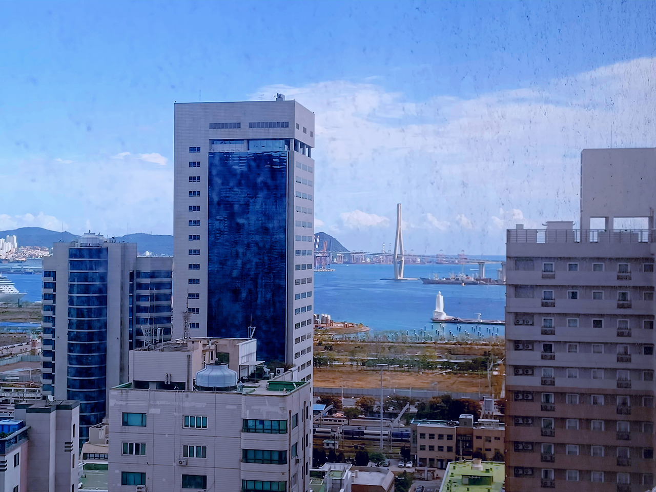 동창을 열자 고층건물 사이, 부산 앞바다 대교 위로 해가 솟아오르고 있었다.
