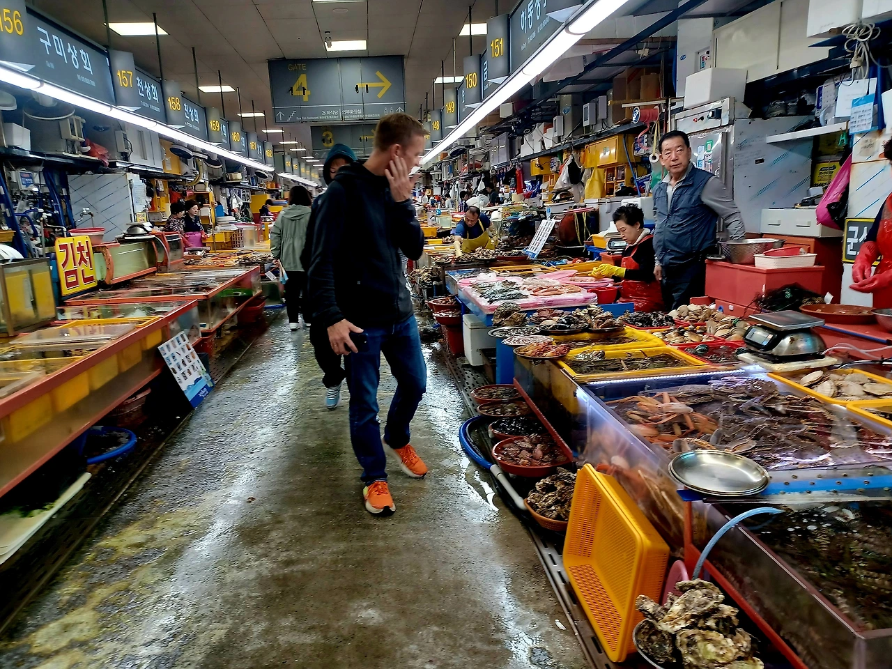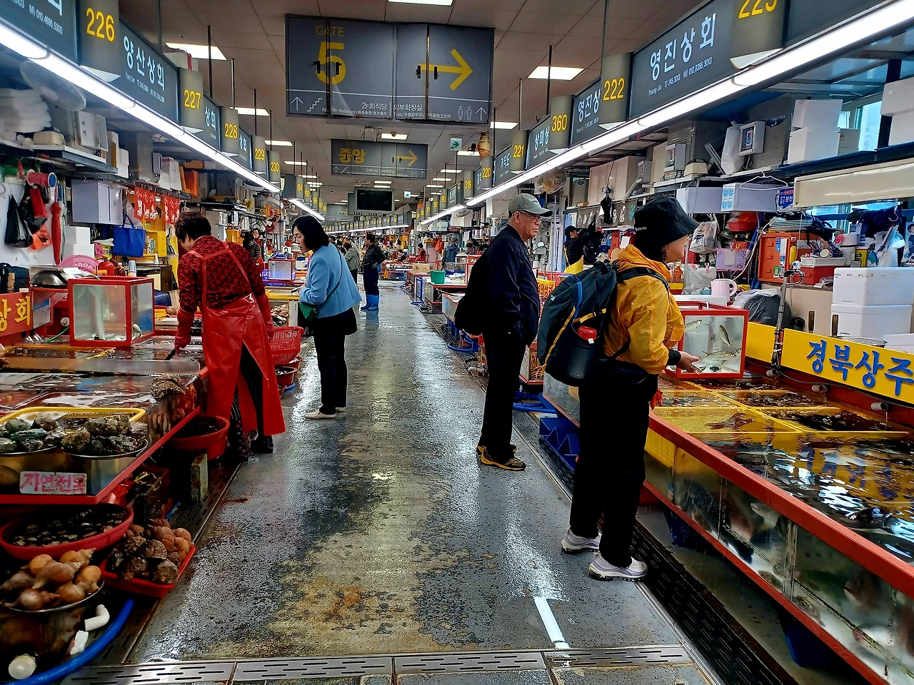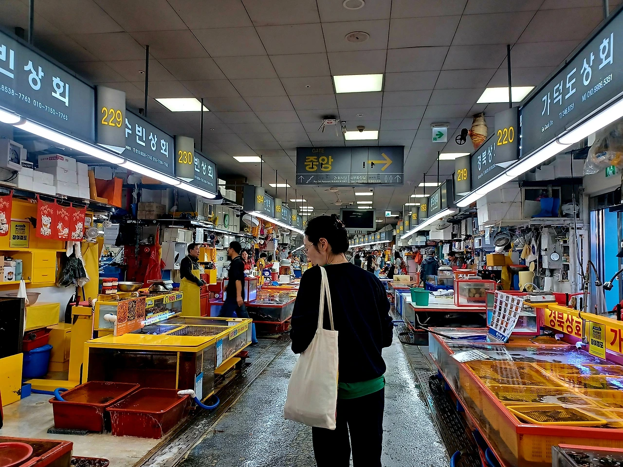 잠깐 맛보기로 자갈치 시장 안으로 들어가 싱싱한 횟감과 해물을 구경했다.