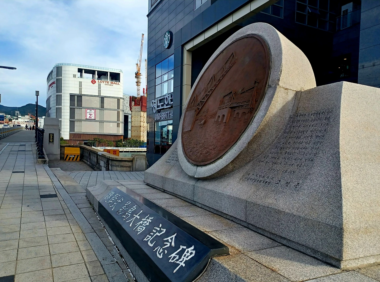 영도땅에 들어서자마자 만나는 두 개의 기념비, 한쪽은 도개식 영도대교 기념비이고 한편은 '굳세어라 금순아'를 히트시킨 현인 노래비다.