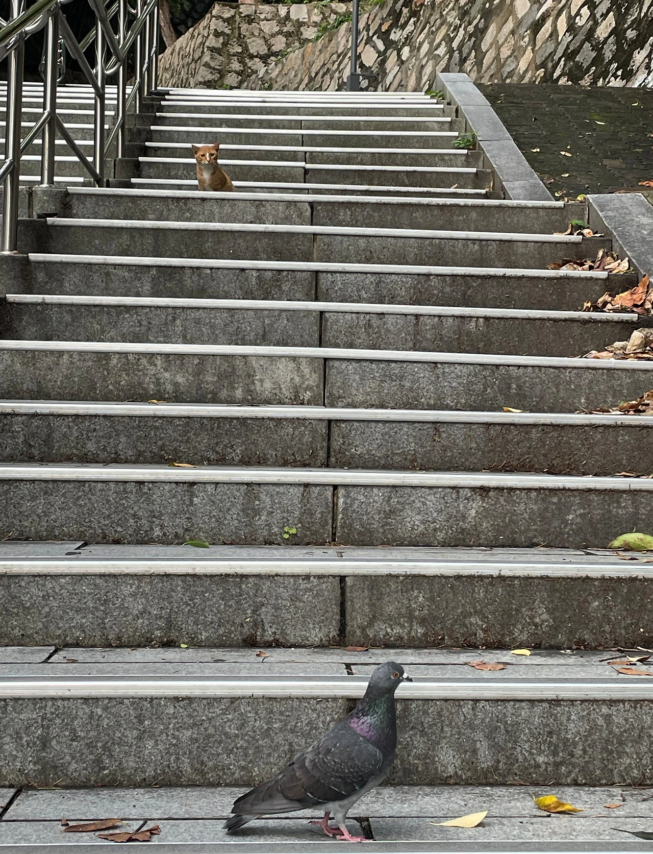 층계를 올라가는데 아직 애송이 티도 못 벗어난 냥이 한 마리가 비둘기를 겨냥하며 미동도 안 하고 사냥감에 집중하고 있었다.