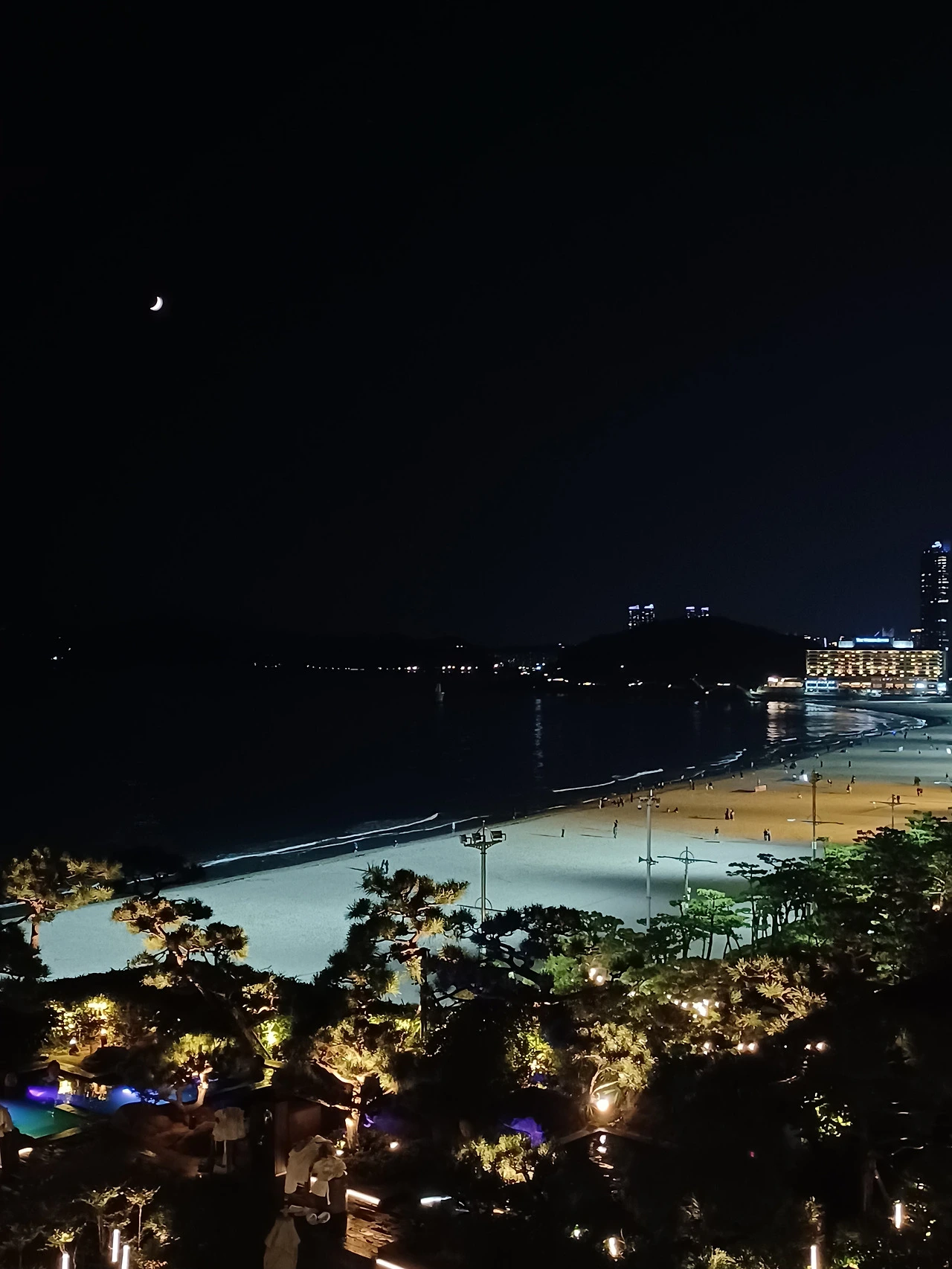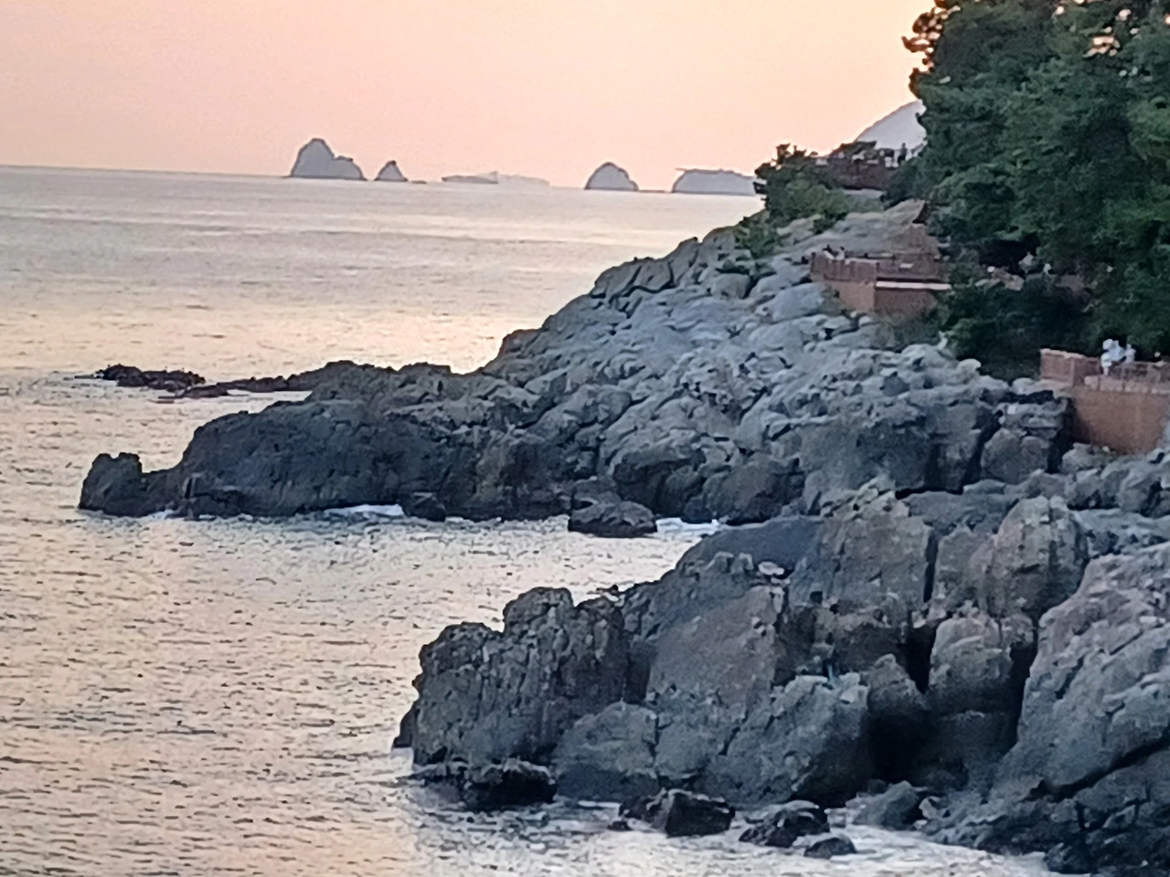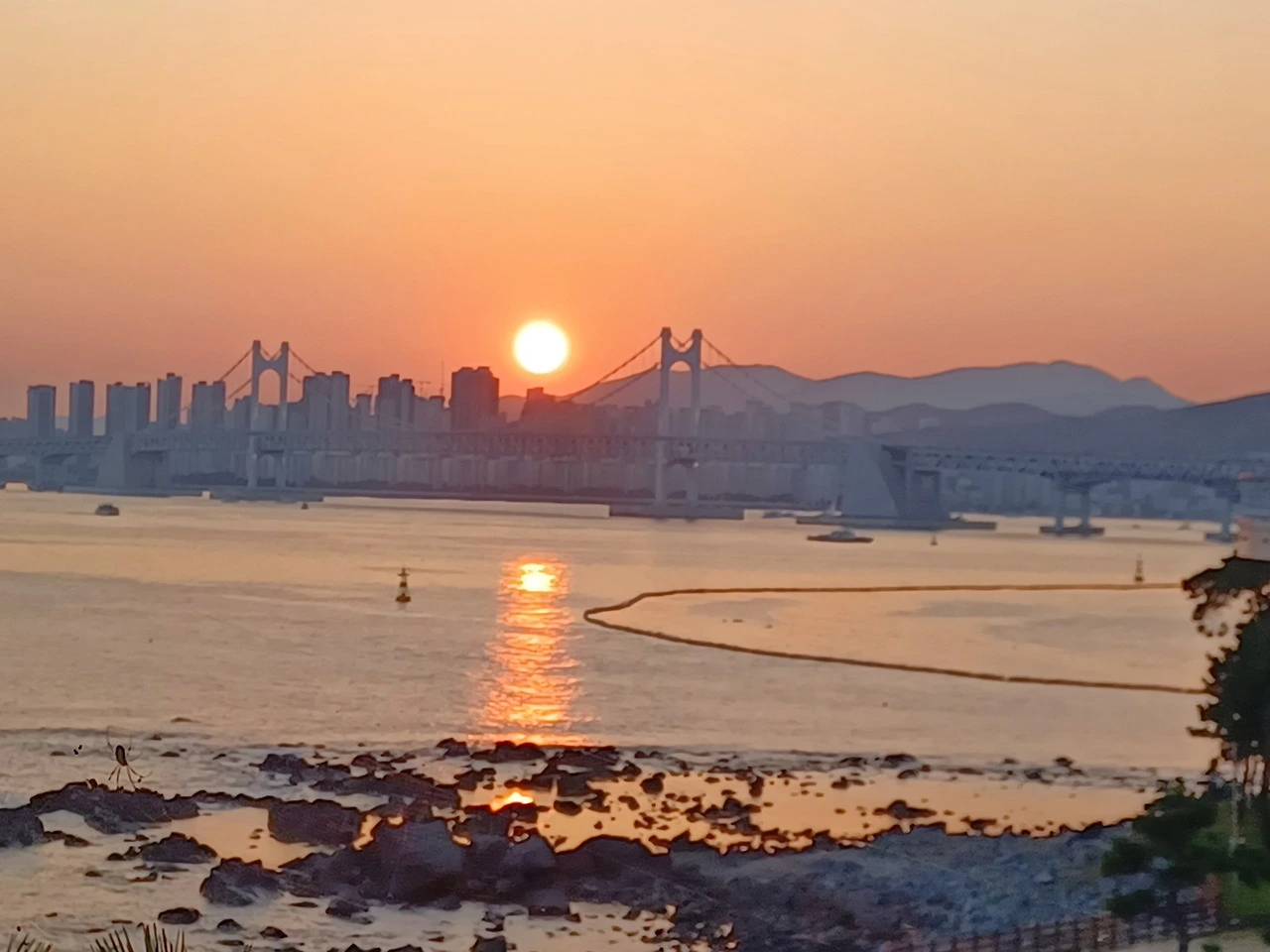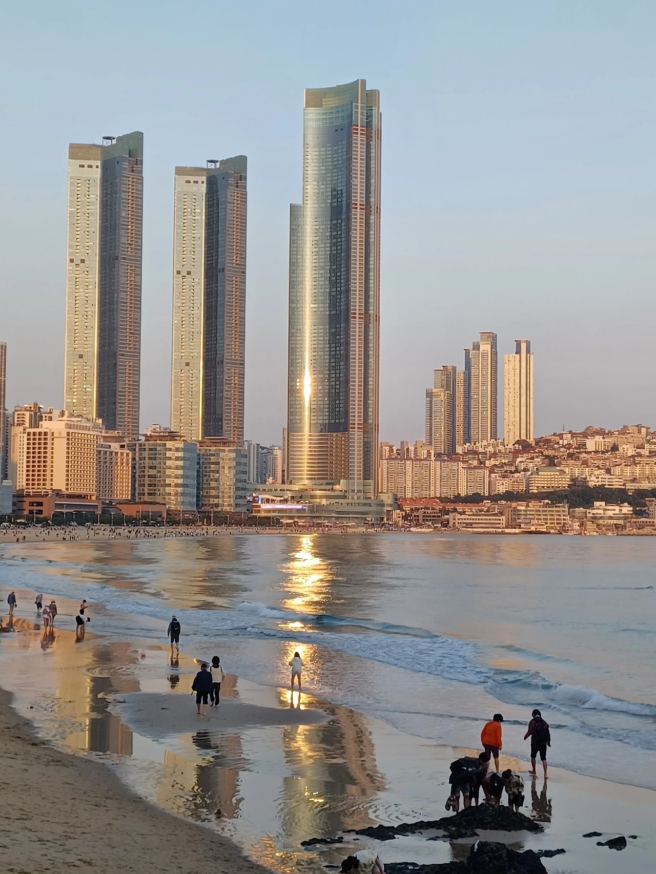 저 건너로 보이는 엘시티 건물이 석양에 반사돼 약한 금빛 반영을 바다에 떨구고 있었다.