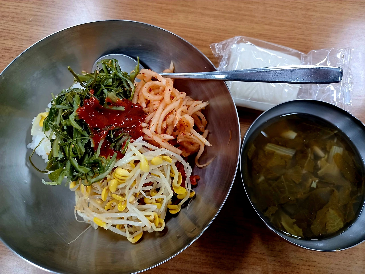 큰 대접에 비빔밥이 담겨있고 내음 구수한 시래깃국 한그릇, 행사가 열리는 날이라 절편 두 쪽도 놓여있었다.