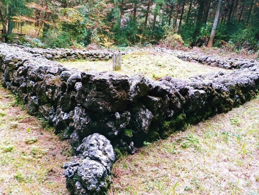 봉분 둘레에 화산석으로 산담 둘러 풀을 뜯던 마소가 드나들지 못하게 경계를 지어놓은 방식 독특하다.
