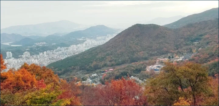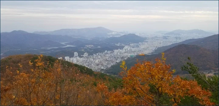 <날씨 청명하면 대마도까지 보인다는데 산자락 사이에 금정구가 안겨있고 저 멀리 광안대교 아슴하다>