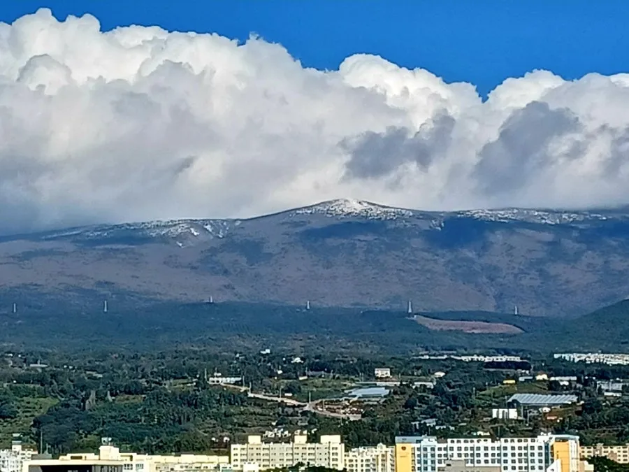백록담 인근에 얹힌 여왕의 은빛 보관으로 이제 매일이 찬란할 아침.