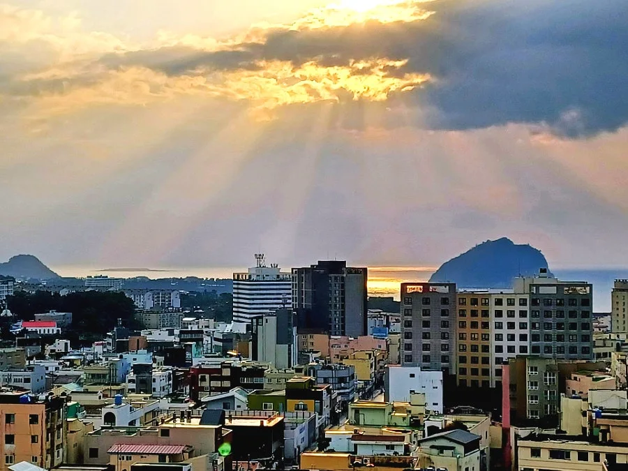 잠에서 깨어나면 동남 창 가득 어리인 금빛 바다, 섶섬과 제지기오름이 그림처럼 앉아있다.