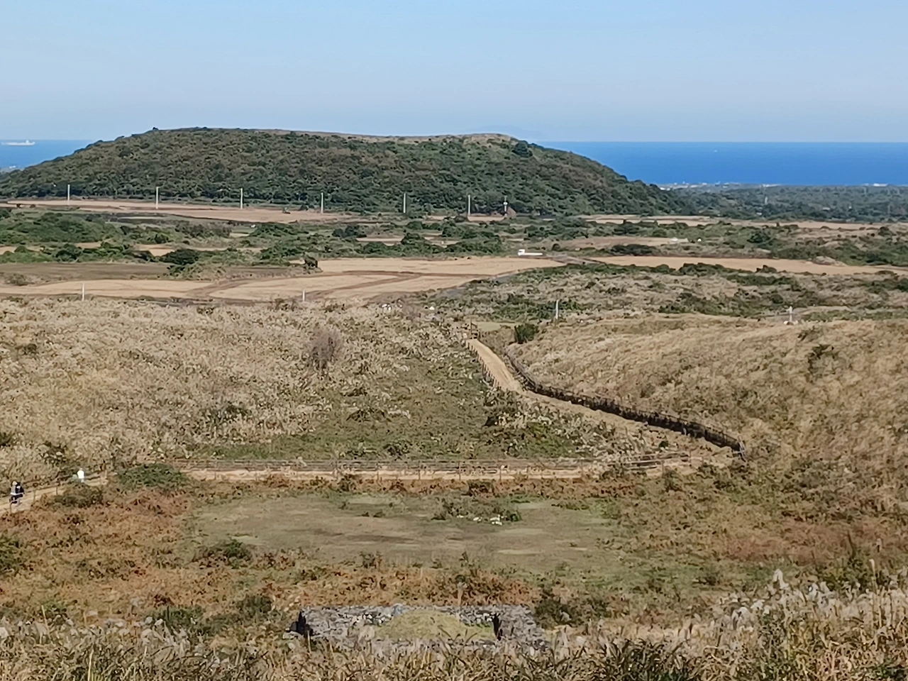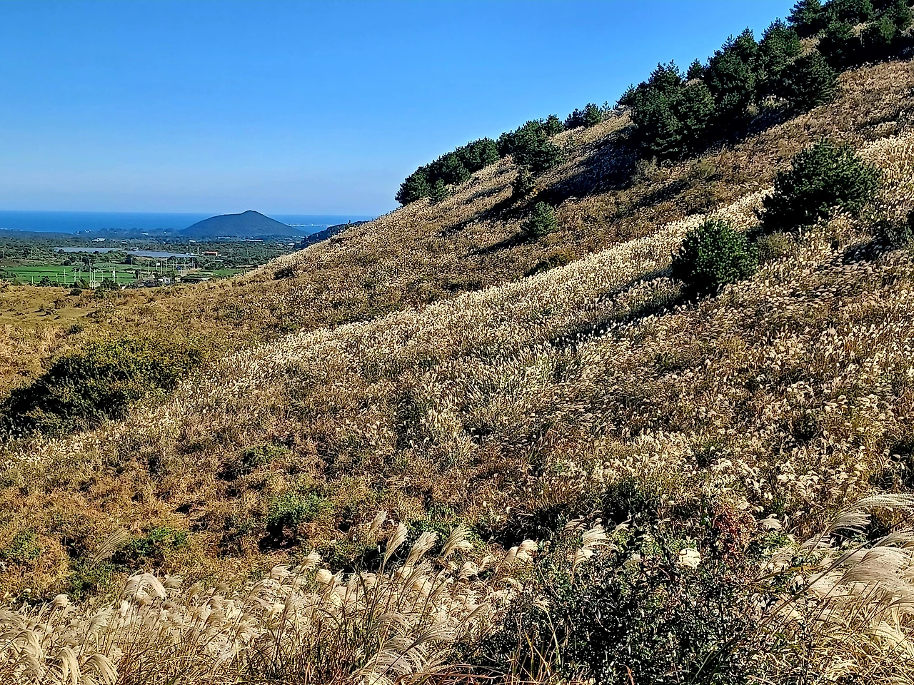 낮으막한 오름이라 산책 삼아 걸을 만 하나 그럼에도 정상에 닿으면 성산일출봉과 우도 바다며 지미봉 두산봉 등이 눈 아래 펼쳐진다.