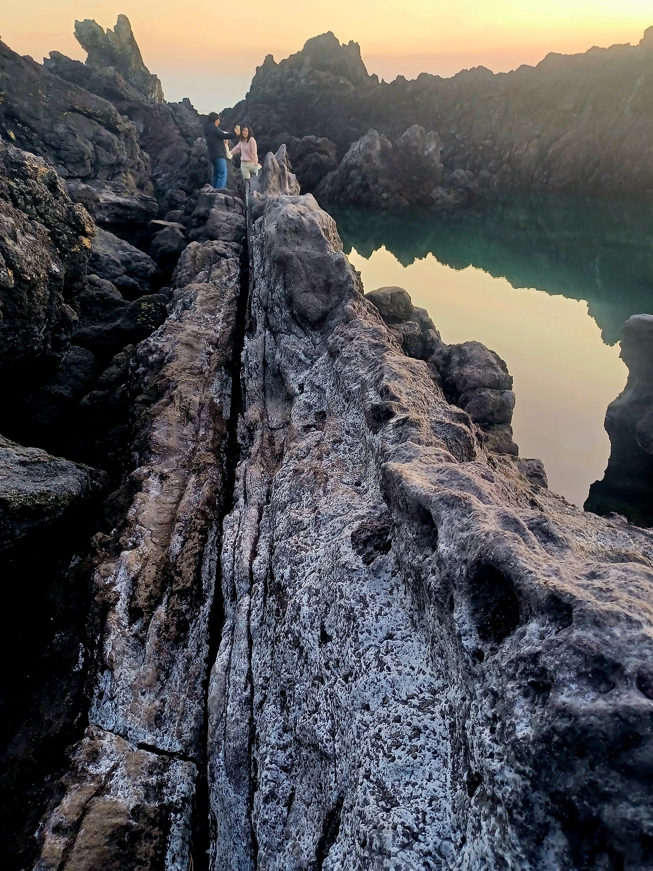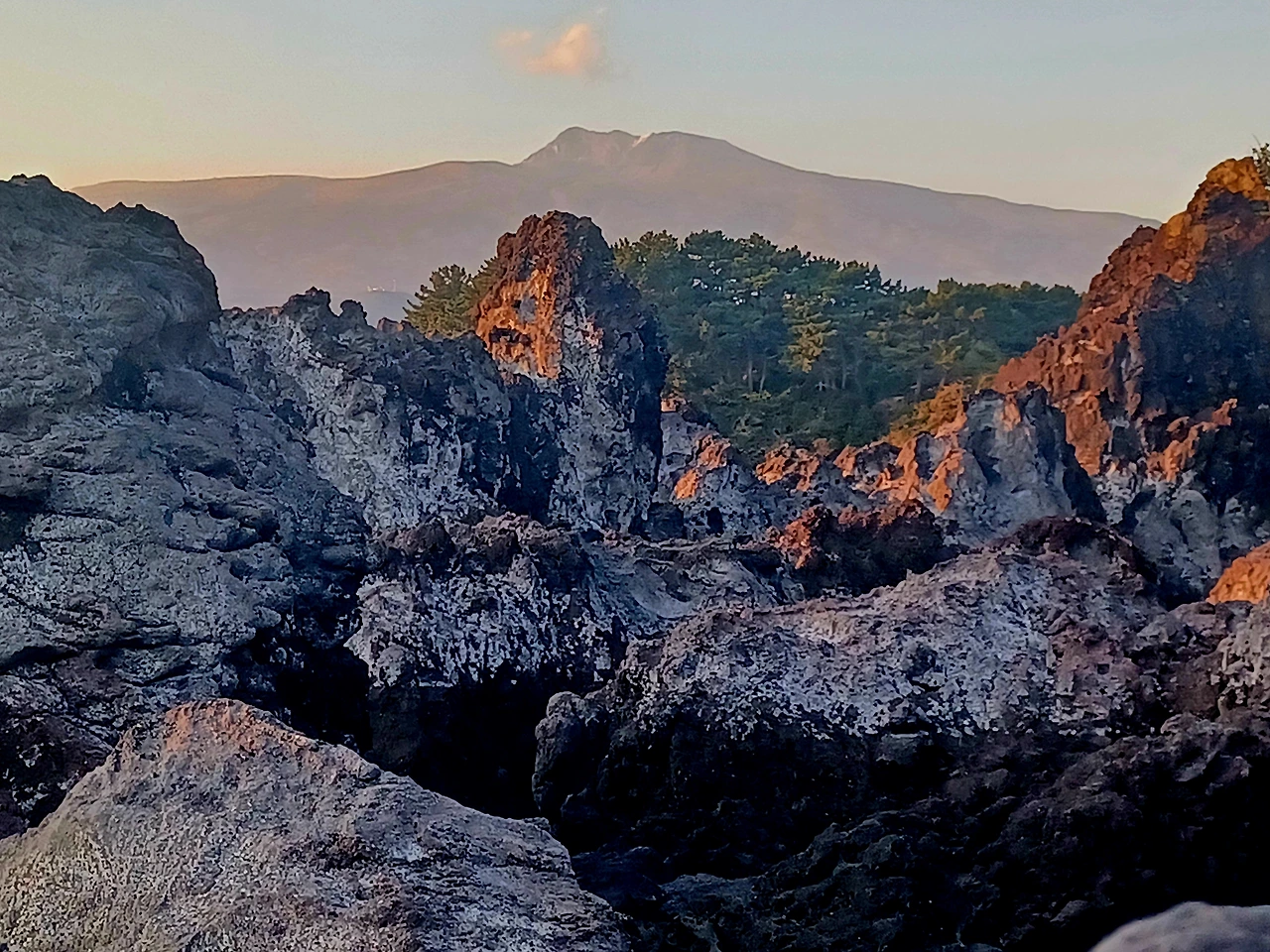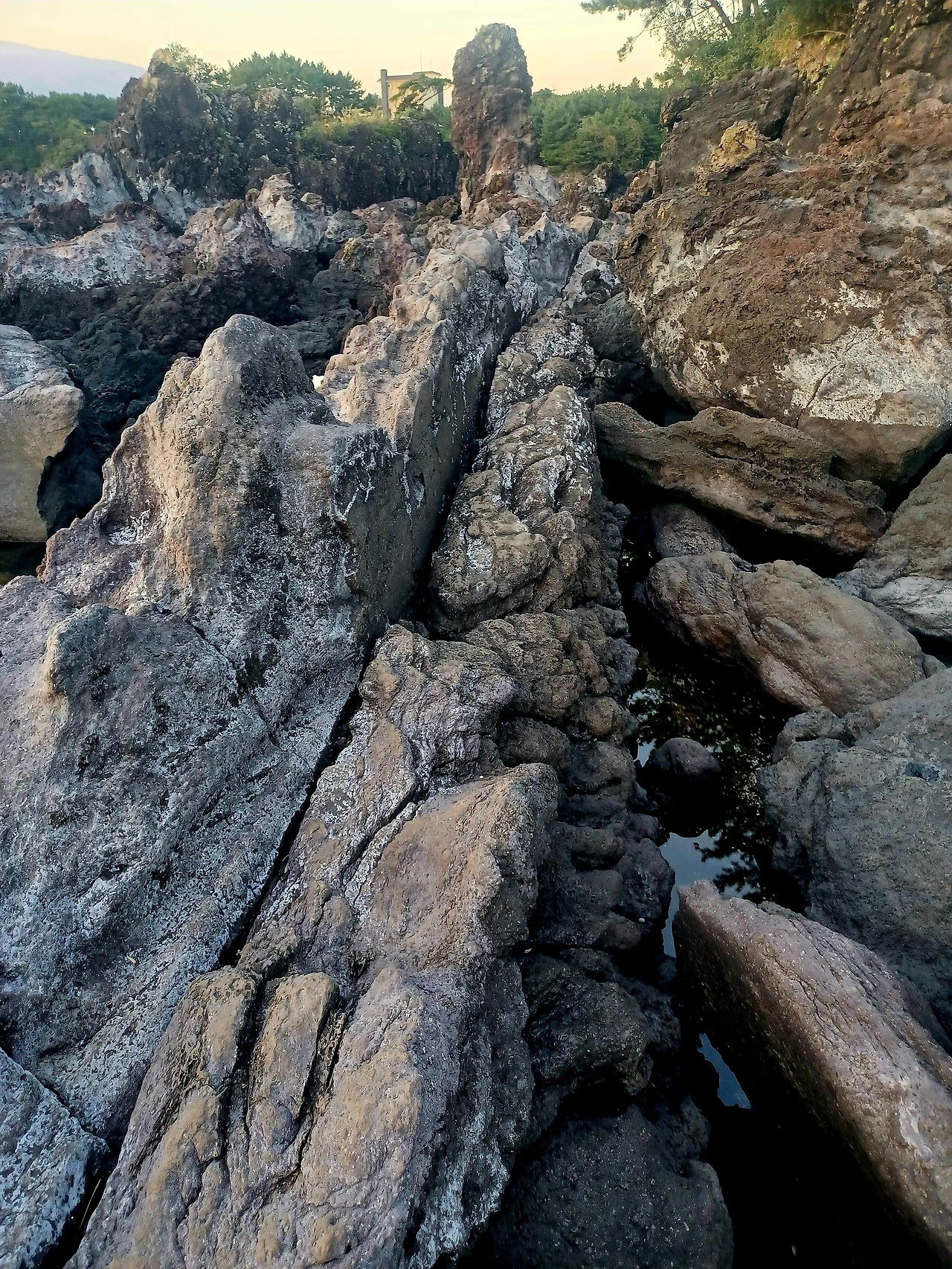 용암 굳어 거뭇한 현무암 치솟아 있는가 하면 허옇고 예리한 암석 길은 마치 공룡 등과 닮았다.