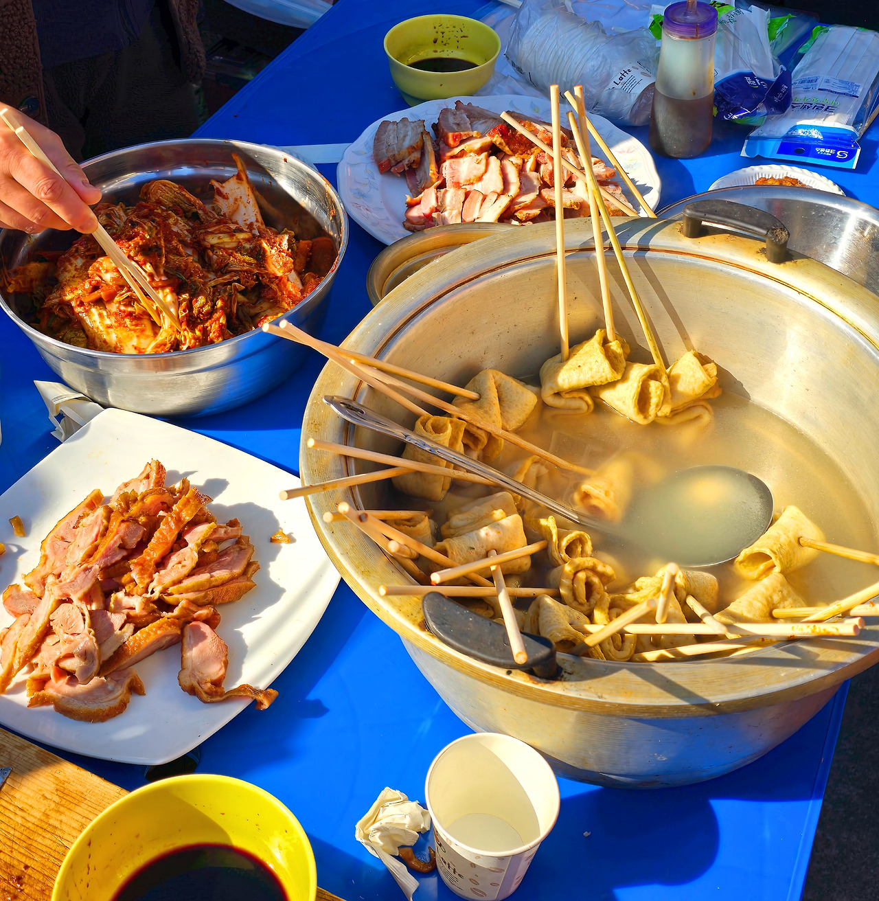 점심상은 생새우 넣고 끓인 뭇국에 배추속대무침 한 대접, 수육 한 쟁반이면 그저 그만이었쥬.