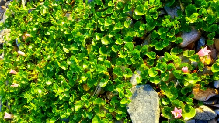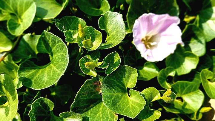 일반 메꽃은 이파리가 엷고 덩굴 뻗어 들풀 마구 감아 오르는데 아직 꽃 피려면 멀었건만, 갯메꽃은 이미 제철이다.