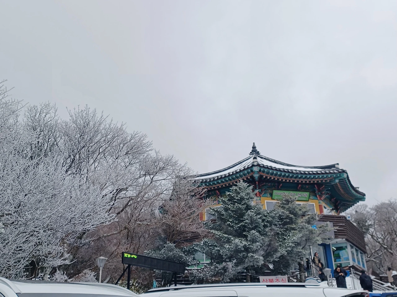예년 눈꽃경관이 피크일 때는 소형차량 진입을 통제했는데 아직 그 수준은 아니라서 열려있는 도롯가 양쪽으로 오가는 차량들 엉켜있었다.