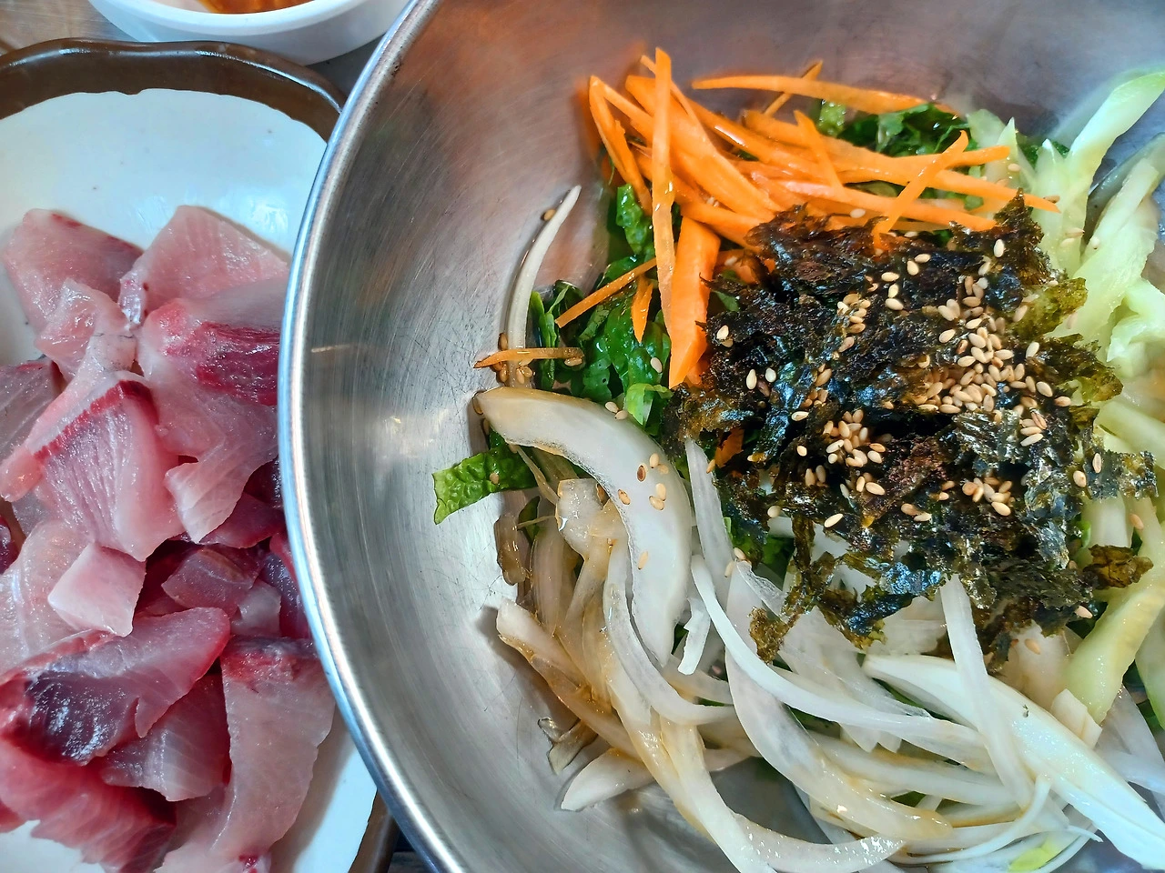 연달아 방어회와 갖은 야채를 담은 대접이 따로 나왔다.
