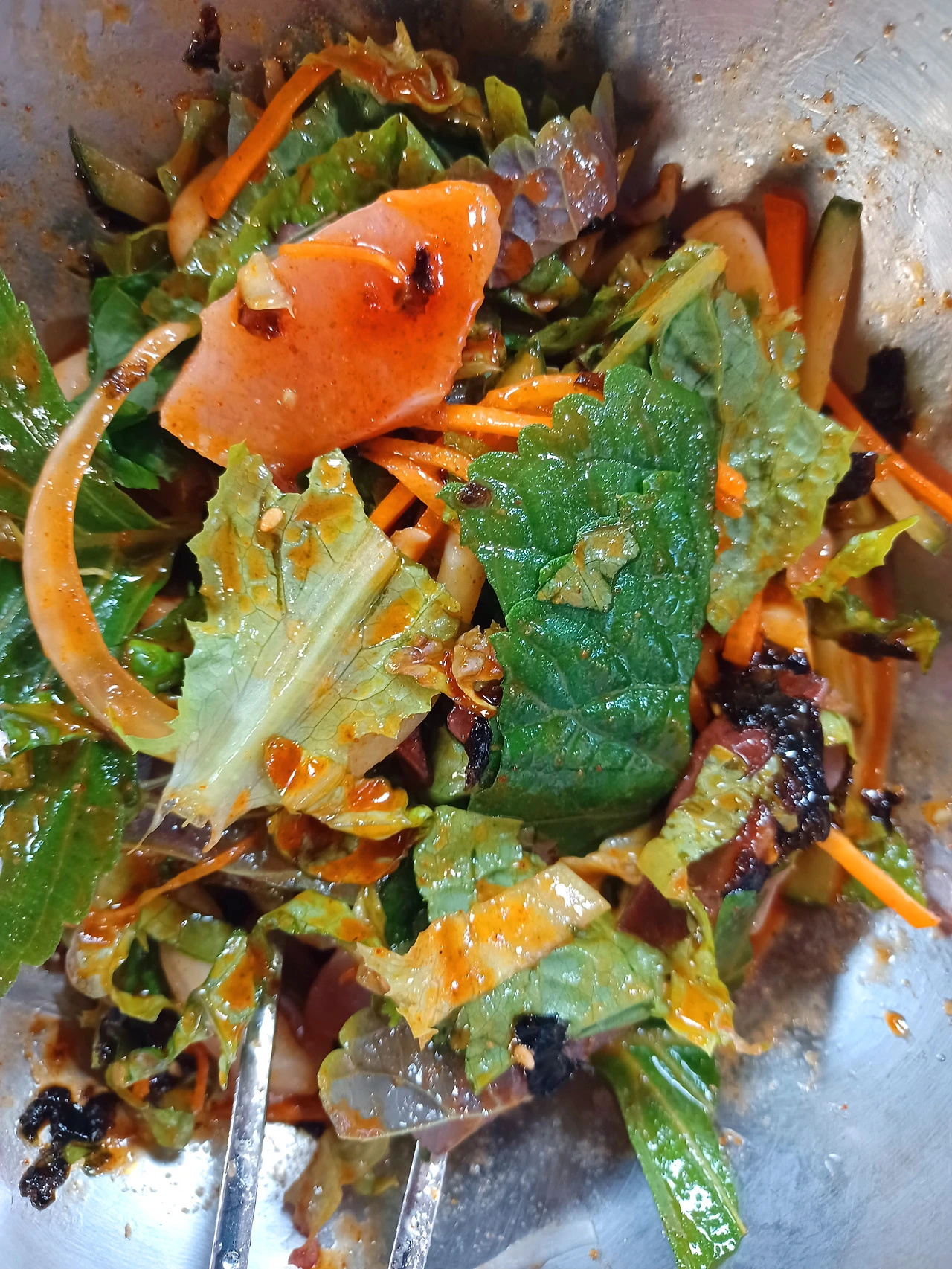 깻잎과 얇게 저민 마늘을 더 첨가해 회무침을 마무리 한 다음 한 입 가득 넣고 맛을 음미해 봤다.