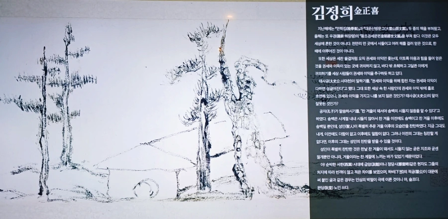 제주 적소에서 한국의 서법을 연구하여 만든 서체인 추사체를 비롯 꾸밈 배제시킨 고담하고 간결한 필선(筆線)으로 서권기 넘치는 세한도를 남겼다.