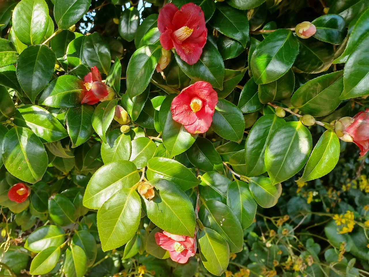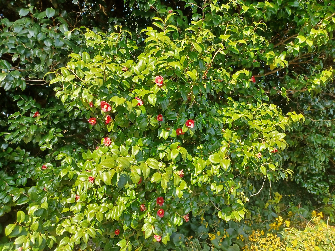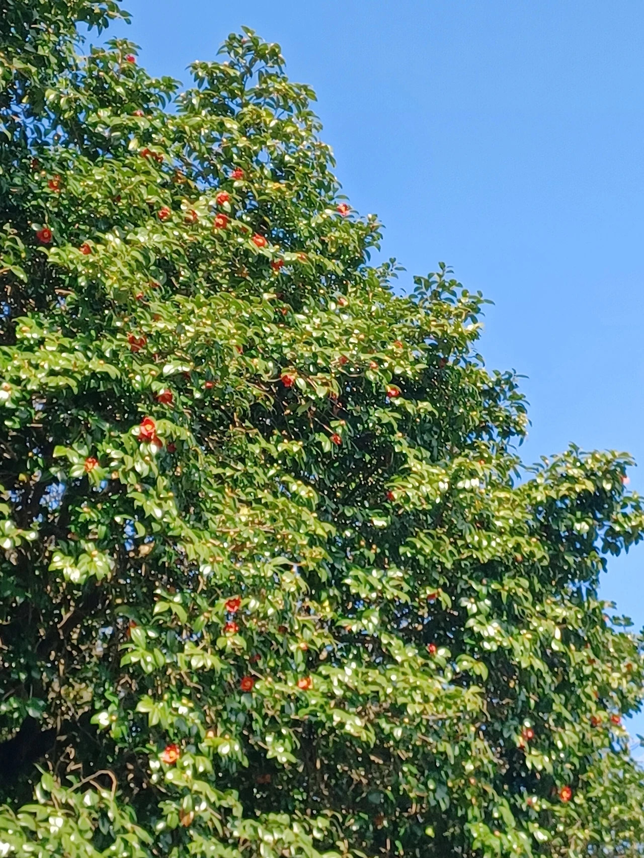 어느 한 그루에만 단아한 토종동백꽃 총총 피어있다.