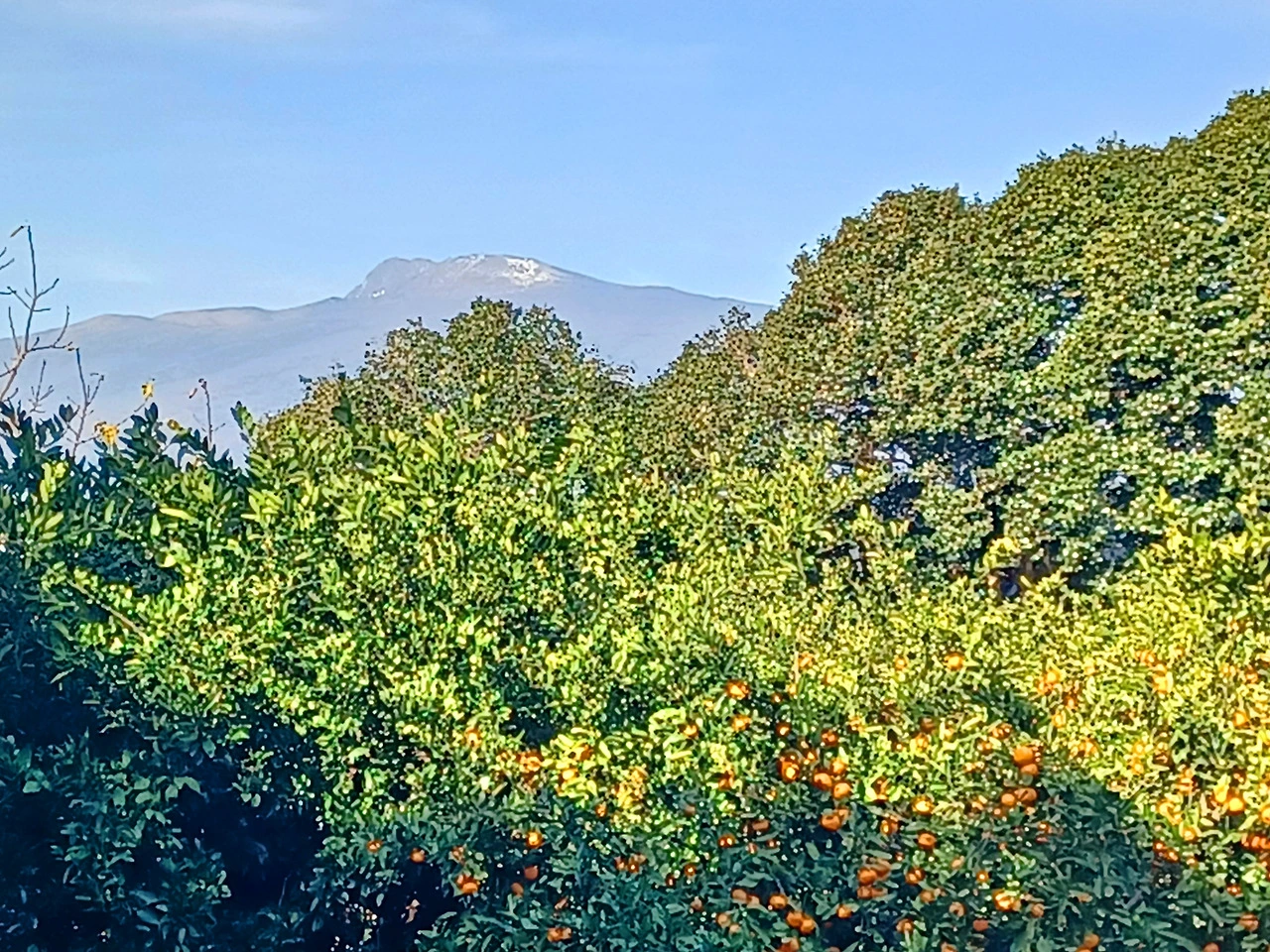 돌담 한 바퀴 도는 동안 귤밭 사이로 자태 드러난 한라산 한 컷 찍은 다음 차도로 나왔다.