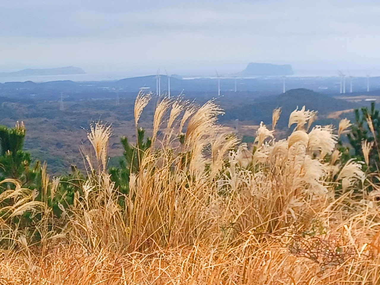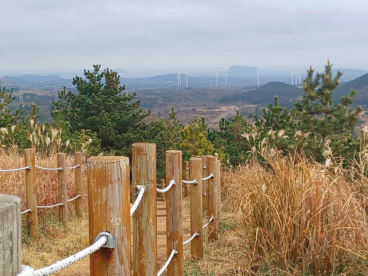 높은 오름, 보미오름, 돌리미오름, 개오름이며 지미봉이 마주 보이다 어느 고도에 이르면 먼바다에 뜬 우도와 성산일출봉까지 뻗어가는 가슴 뛰는 절경이 파노라마로 펼쳐진다.