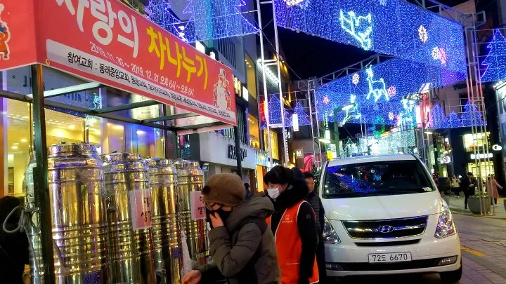 상가 부녀회, 각 교회에서 자원봉사 나온 사랑의 차 나누기, 따끈한 생강차가 영하의 기온을 녹여줬다