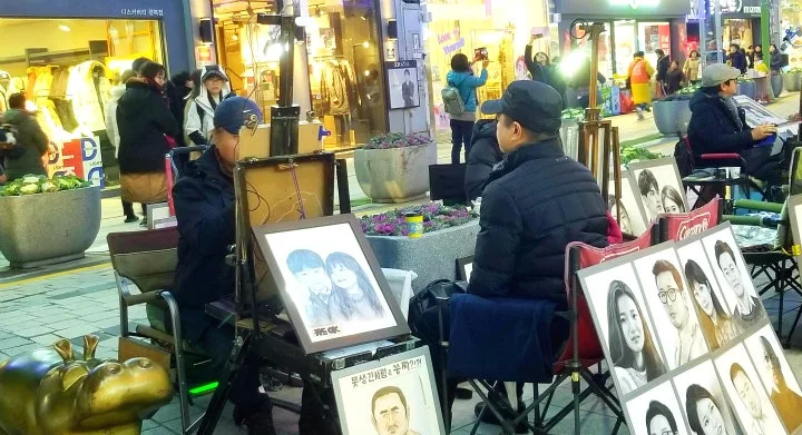 자못 심각하게 마주 앉아 설핏 웃음 짓게 하던 두 사람, 초상화와 캐리커처를 그리는 거리화가