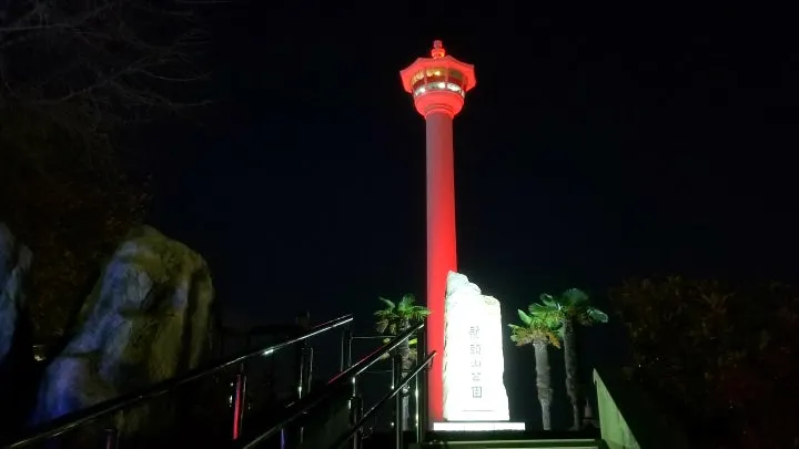 칠흑 어둠에 싸여 색색이 변하는 부산타워만 도드라진 용두산공원