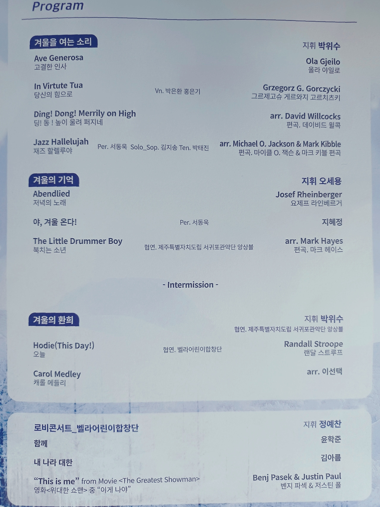 겨울의 기억 파트에서 둥둥 '북 치는 소년'은 그 리듬감이 내 가슴까지 와닿아 파동 쳤으며 겨울의 환희 캐럴 메들리는 다 함께 손뼉 치고 어깨 흔들며 발장단까지 치면서 떼창으로 불러젖혔다.