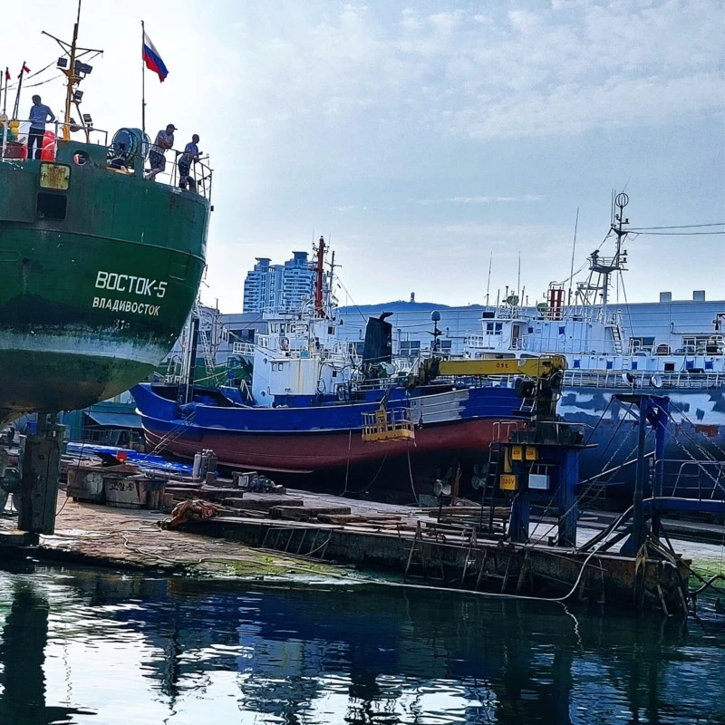 수리받기 위해 들어온 배 외벽에 붙은 조개를 떼어내고 녹 벗겨내는 망치 소리가 강철 판에 부딪히며 깡깡 소리 그치지 않았다.