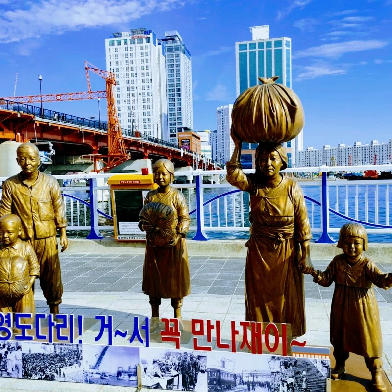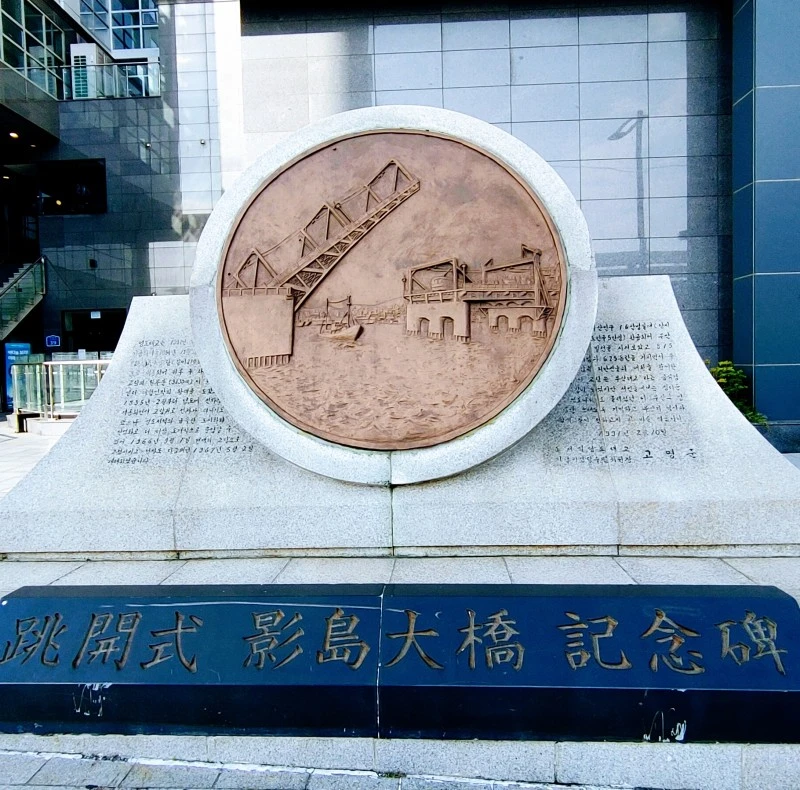 자갈치의 피란민 가족상 일별하고 다리 건너 영도에 닿으면 영도다리 상징물이 기다린다.