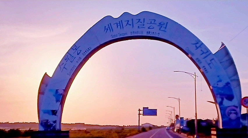 차도로 나오자 세계지질공원 아치 뒤편 서녘에 노을빛 어리기 시작했다.