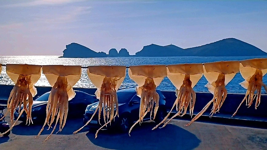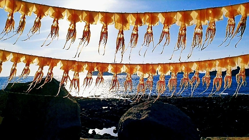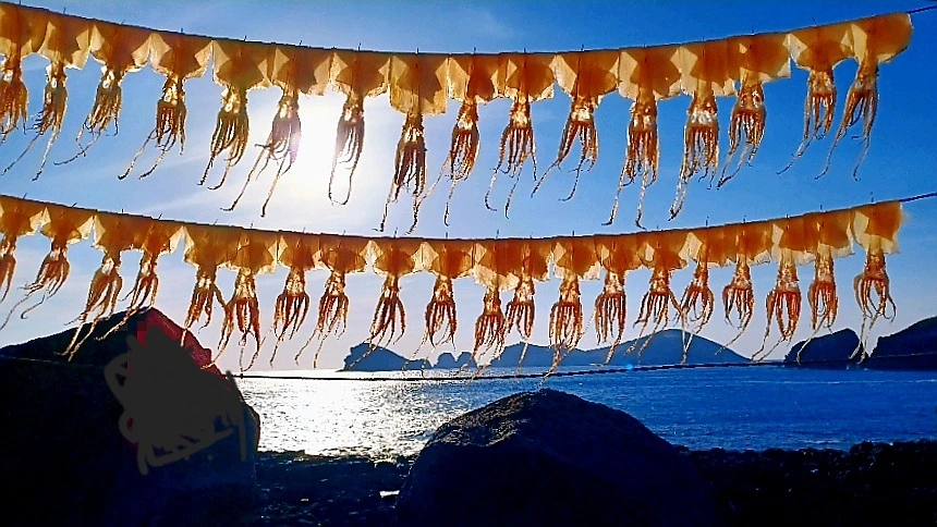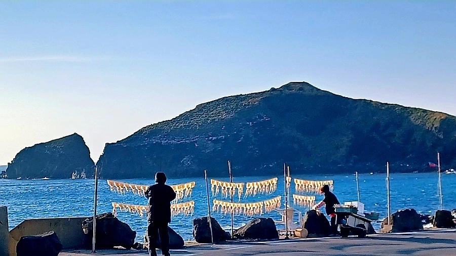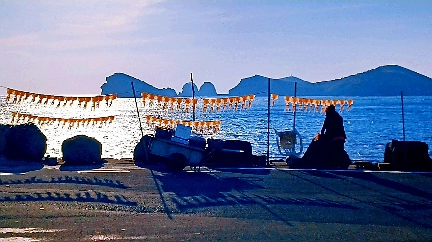 바람이 떠밀어주는 그네 타며 몸을 말리는 오징어가 프레임 그럴싸한 풍경을 연출해 준다.
