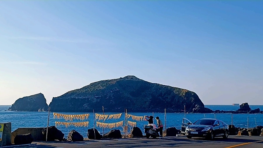 환해장성을 찾아다니던 중 어느 해안가에서 오징어를 뒤집기에 어부에게 물어봤다.